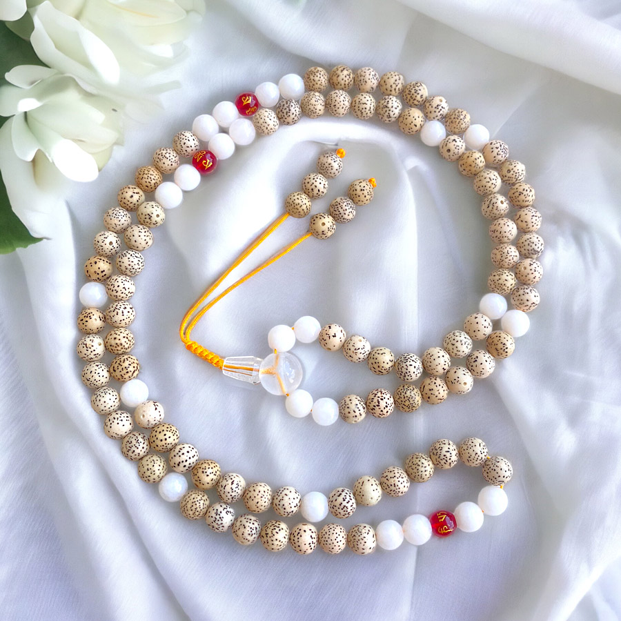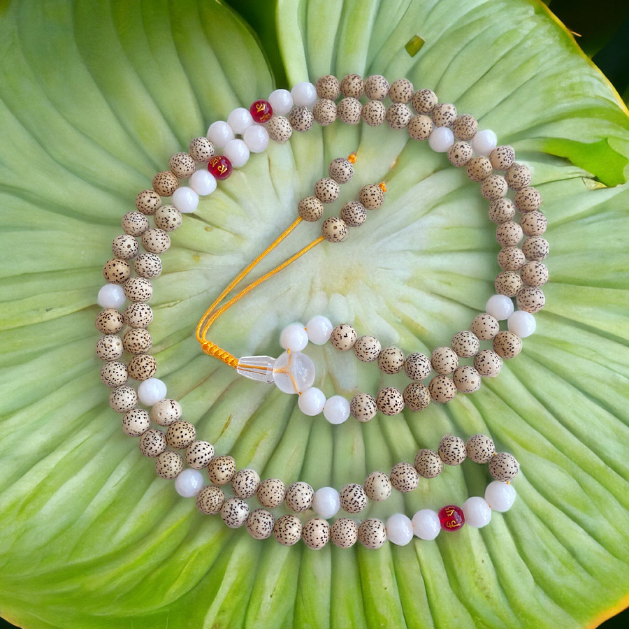 108 szemes valódi lótusz magokból készült lótusz mala, fehér jáde és Om Mani Padme Hum mantrás osztókkal. Normál 8 mm-es a szemek mérete. Csúszócsomós kialakítás, így állítható a szemek távolsága.