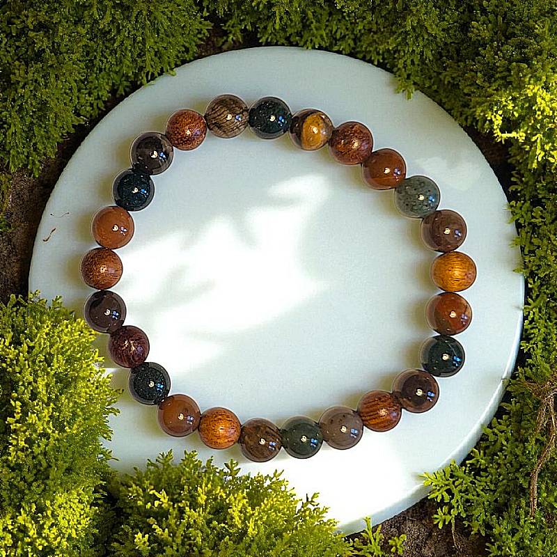 Átlagos méretű, strapabíró dupla rugalmas szálra fűzött, 100%-ban eredeti ásványból és rózsafából készült karkötő. 8 mm-es normál szemekből készült karkötő.