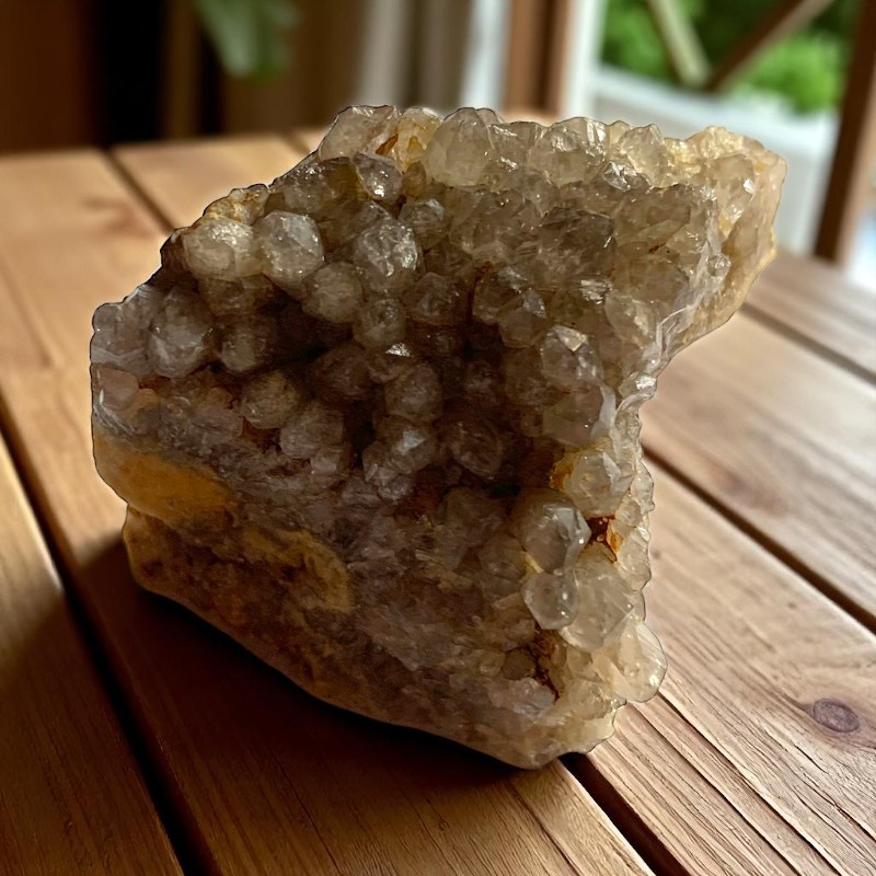 Ametisztként ez a kő elsősorban a tudatosság és spirituális éberség köve, amely segít lecsendesíteni a zaklatott gondolatokat, és támogatja az intuíciónk megerősödését. Ez a példány különösen jól illeszkedik természetes anyagokból készült enteriőrbe, de jól mutat jóga- vagy meditációs sarokban is.