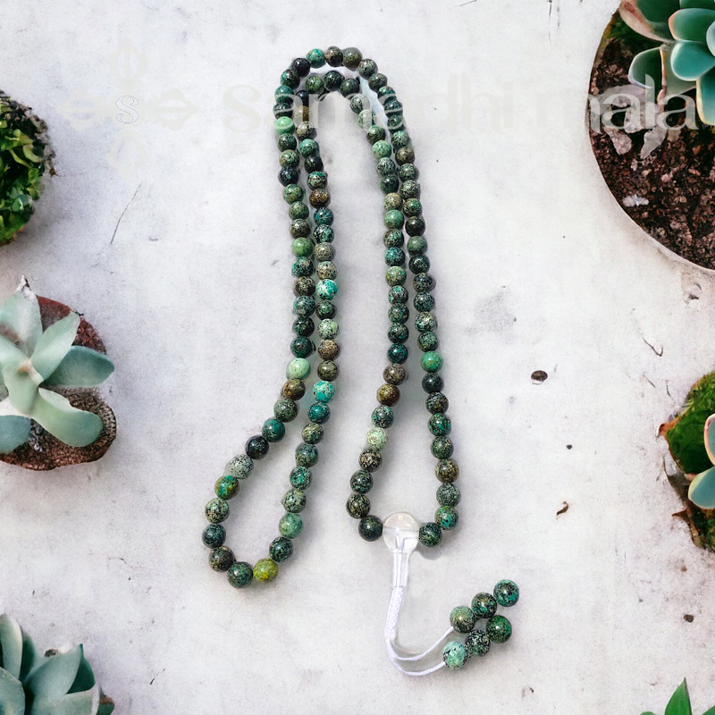 108 szemes valódi türkiz ásvány mala hegyikristály guruszemmel. A szemek átmérője normál méretű, 8 mm-es. Csúszócsomós kialakítás, így állítható a szemek távolsága és a mala mérete.