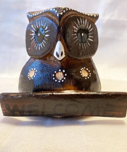 Indonéz faragott bagoly szobor fából, üdvözlő táblával.