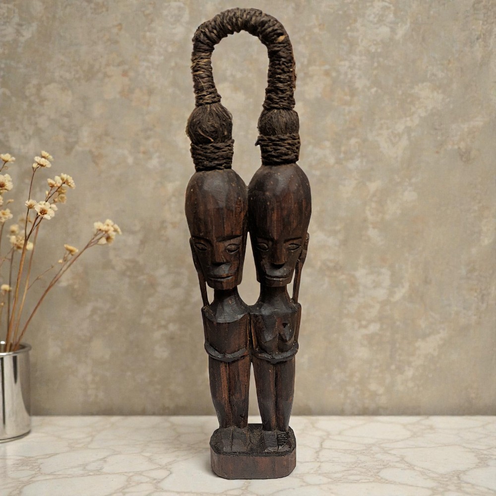 A szobor tömör fából készült, láthatóan egyetlen darabból faragva. A felületen megmaradtak a kézi vésés nyomai, ami hiteles, nyers karaktert ad a tárgynak. Az arcok stilizáltak, nyugodtak, kissé befelé fordulók, ami jól illeszkedik a balinéz szobrászat hagyományos, nem realista, hanem szimbolikus ábrázolásmódjához. A fa sötét, természetes tónusa időtálló, patinás hatást kelt.