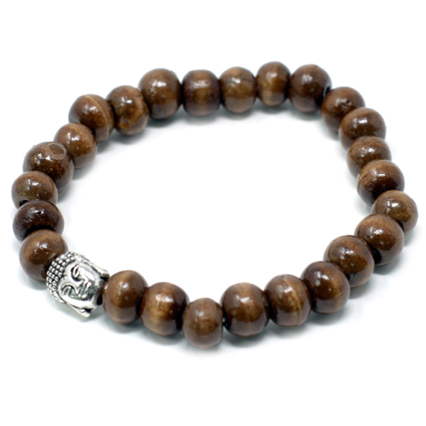 Jó minőségű fából készült karkötő Buddha fej osztóval. Átlagos méretű és rugalmas szálra fűzött.