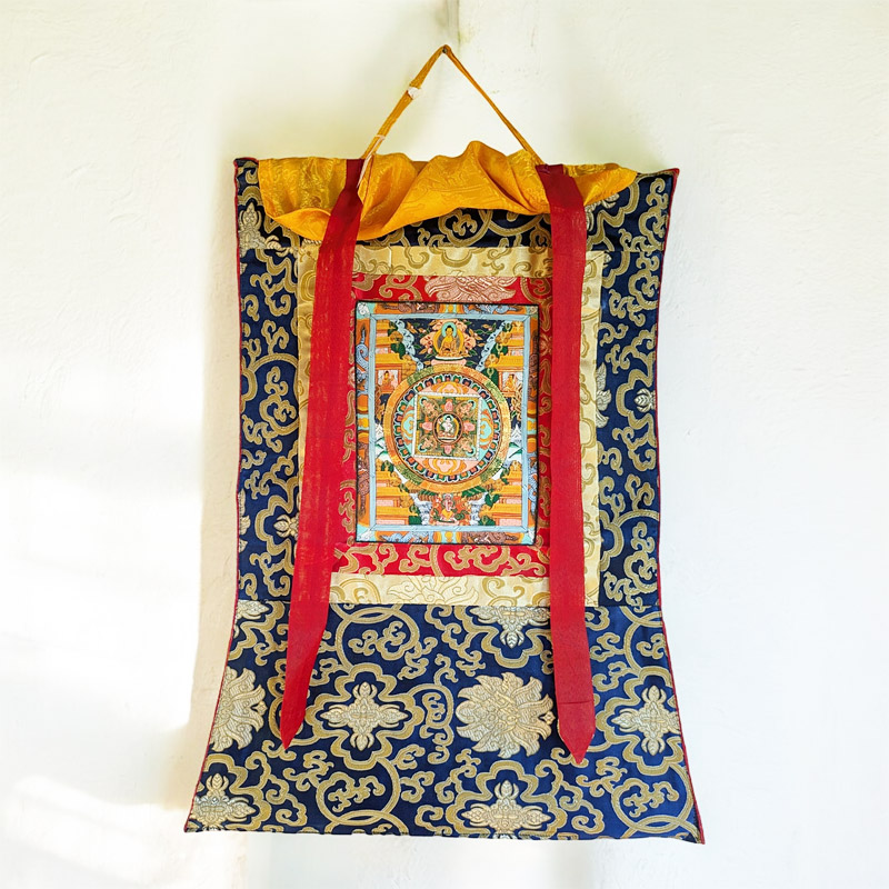 Kézzel festett eredeti Buddha mandala thangka kiváló minőségű brokáttal.