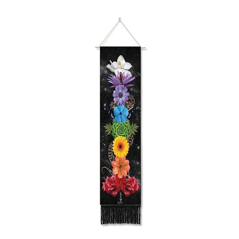 A zászló látványvilága a klasszikus csakraszimbólumok helyett egyedi virágokkal jeleníti meg az egyes energiaközpontokat. Ez a megközelítés finomabb, természetközelibb kapcsolatot hoz létre a csakrákkal, és kiválóan alkalmas arra, hogy meditatív állapotban vizuális vezetőként működjön.