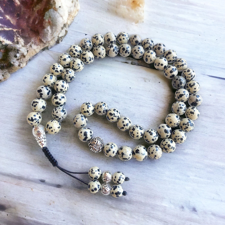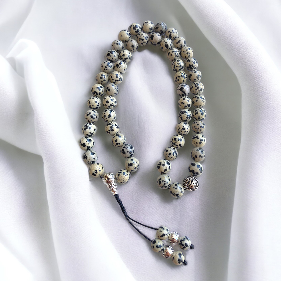 A mala természetes dalmata jáspis ásványból készült, amely jellegzetes fekete és fehér pöttyökkel díszített. Ez az ásvány kötődést hoz létre a föld energiáihoz, és segít a negatív energiák elvezetésében, valamint a pozitív és gyógyító energiák befogadásában. A nagy szemek erős jelenlétet és feltöltődést jelentenek, ami fokozza a malában rejlő energiát.