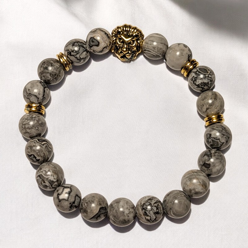 Vegyes műgyanta, üveg, és ásvány szemekből készült karkötő. Átlagos méretű, rugalmas szálra fűzött karkötő.