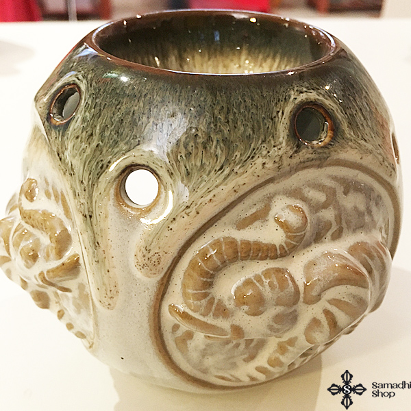 Kb. 11 centiméter átmérőjű kerámia illóolaj párologtató, amelybe mécses helyezhető, és illóolaj tölthető a tetejére.