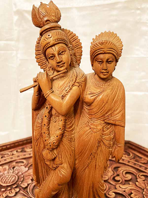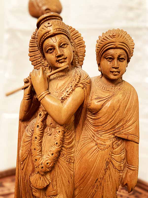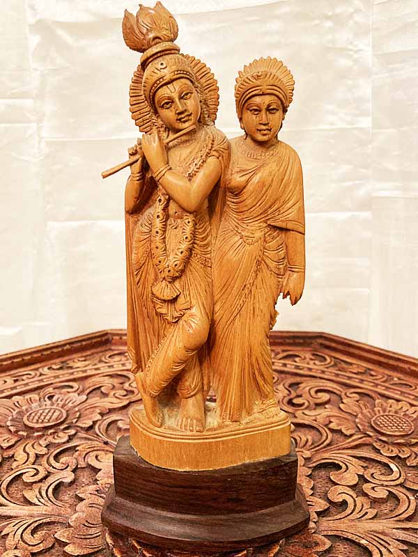 Eredeti, szantálfából készült, gyönyörűen kidolgozott Krishnát és társát ábrázoló szobor. Magassága: kb. 25 cm.