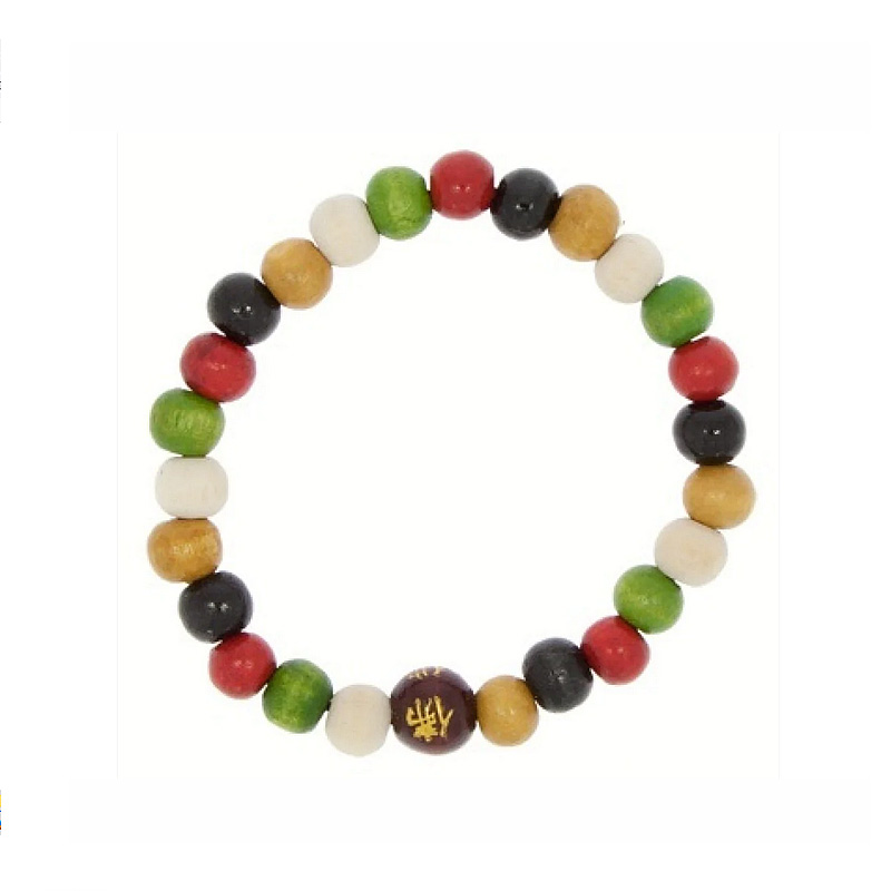 Rugalmas damilra fűzött fa karkötő színes szemekkel.