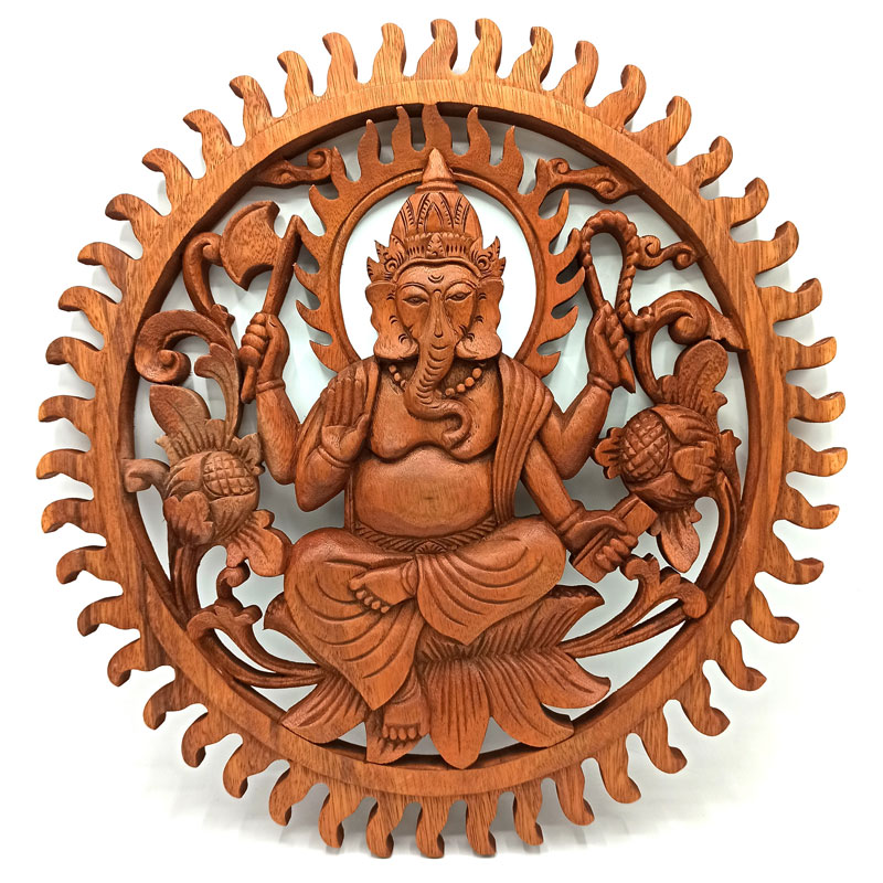 Csodálatos Ganésa falikép minőségi suar fából faragva. Nem csak különleges szépsége, de 40 cm-es átmérője is egyedivé teszi ezt a faliképet.