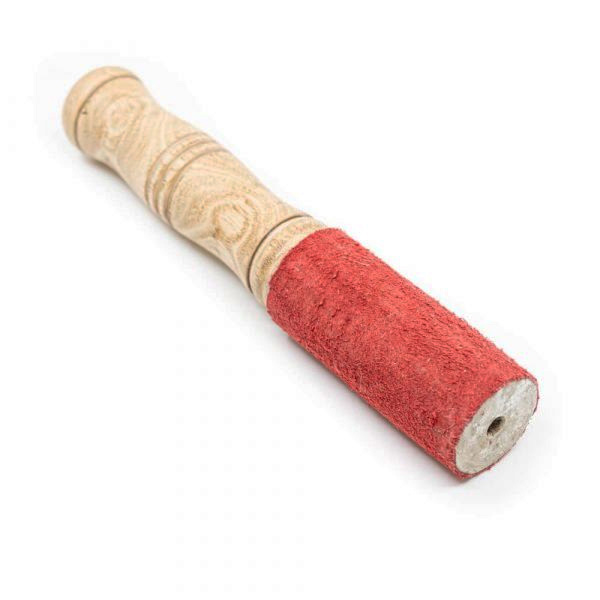 Fából készült hangtál ütő, a végén filc borítással. Hossza: 18 cm.