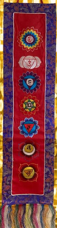 Akasztó nélkül 95 cm magas gyönyörűen hímzett 7 csakra szimbólumos fali függő Nepálból.