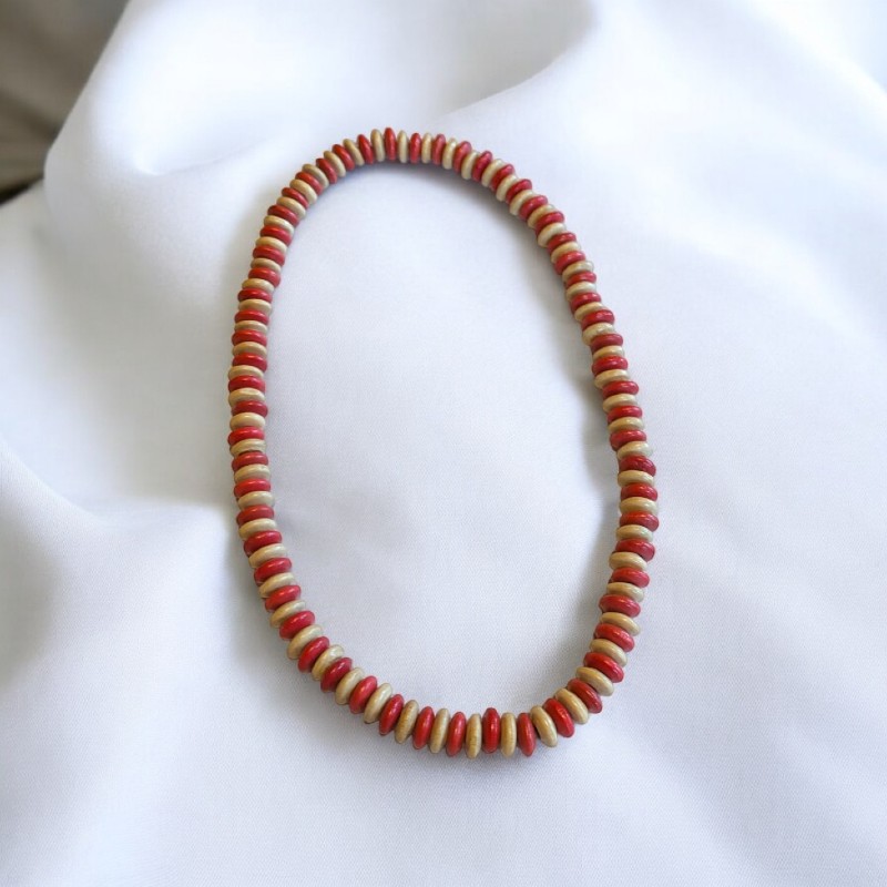 Fából készült indonéz fa nyaklánc, rugalmas szálon.