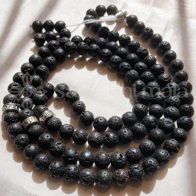108 szemes lávakő mala Om Mani Padme Hum mantrás osztókkal. A szemek átmérője normál méretű, 8 mm-es. Csúszócsomós kialakítás, így állítható a szemek távolsága és a mala mérete.