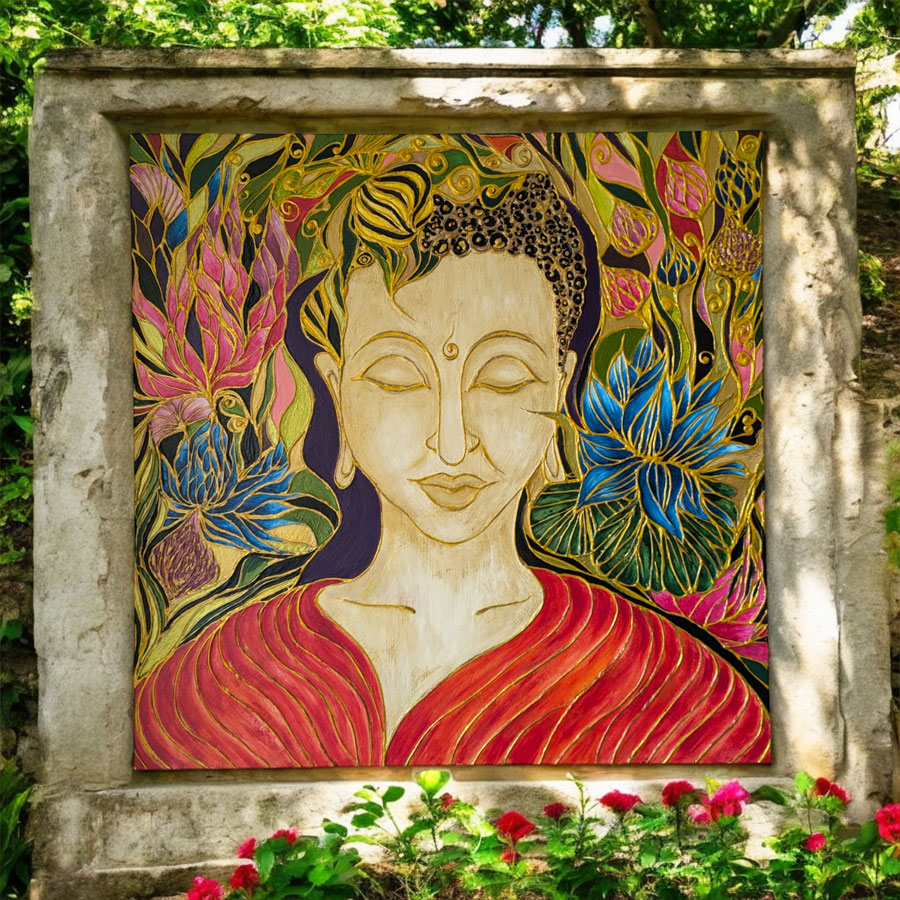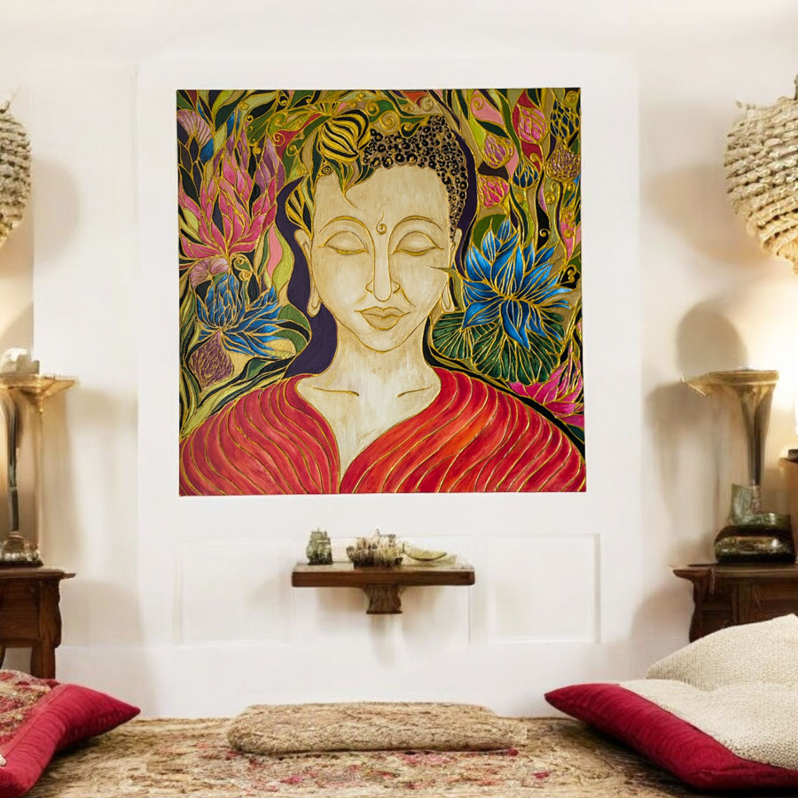 Engedje, hogy otthonát betöltse a béke és harmónia ezzel a lenyűgöző, kézzel festett akril festménnyel, amely Buddhát ábrázolja lótuszok között. Az alkotás vibráló színei – az arany, a mélyvörös, a kék és a zöld árnyalatai – életre keltik a spirituális témát, miközben a textúrált, dombor hatású felület különleges mélységet és eleganciát kölcsönöz a műnek.
