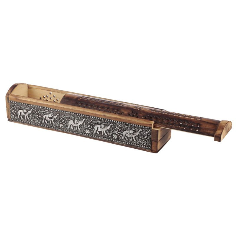 Többfunkciós mangófa füstölőégető doboz, fából elkészítve, különleges elefánt mintás fém díszítéssel. Hossza kb: 30 cm.