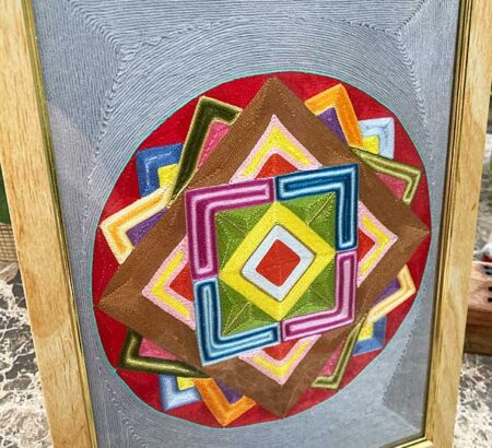 Mécsestartó fából készült talapzattal és arany színű antikolt fém hátlappal.
