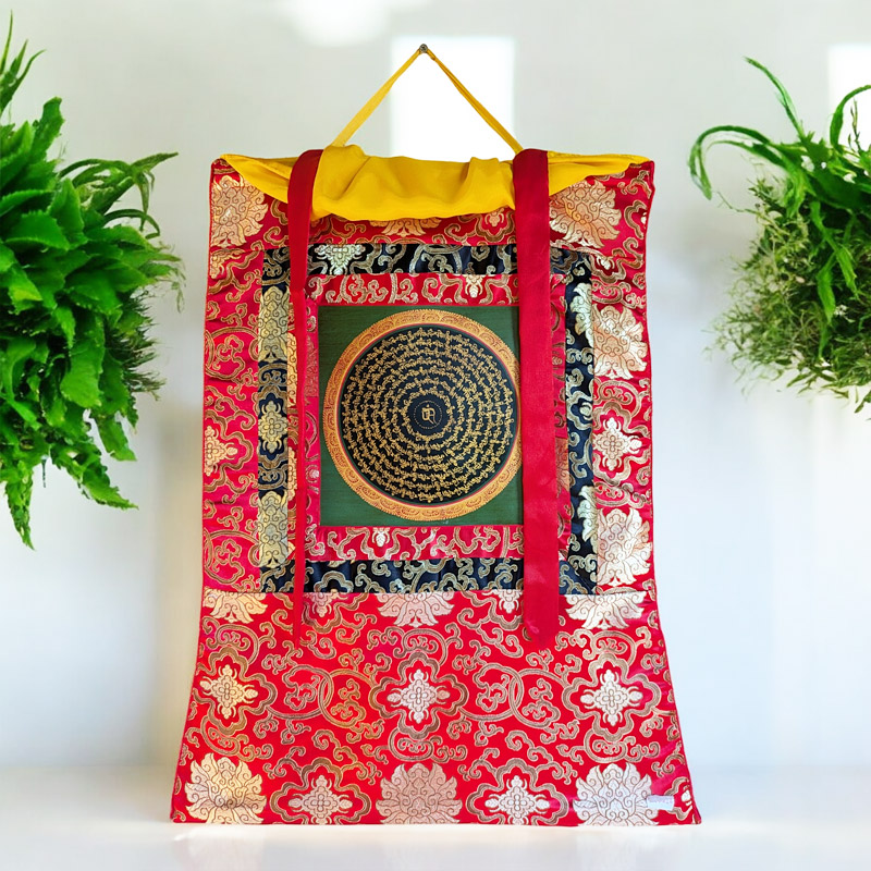 Kézzel festett eredeti buddhista mandala thangka kiváló minőségű brokáttal. Az Om Mani Padme Hum mantra található az olajfestményen körkörösen, arany festékkel megfestve, középen pedig egy Kalacsakra szimbólum.