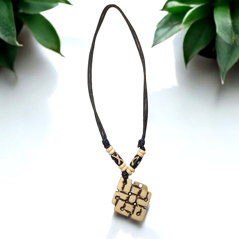 Nepáli dzi gyöngyös nyaklánc, állítható méretű szíjjal, csont végtelen csomó medállal.