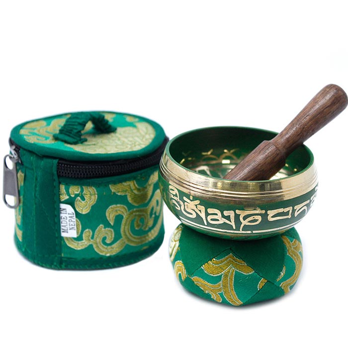 Kis méretű Om Mani Padme Hum mantrás hangtál együttes, alátéttel, tokkal, ütővel együtt.