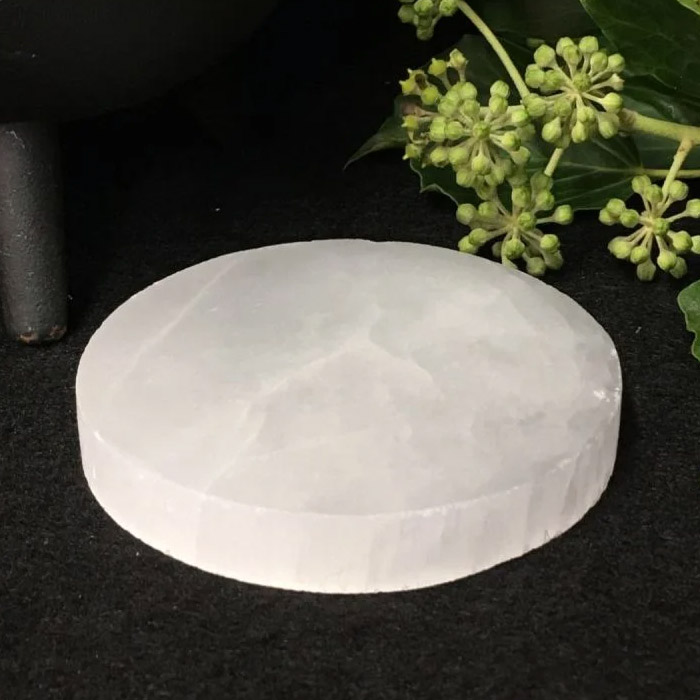 10 cm átmérőjű egynemű szelenit ásvány hangoló alátét. 1,5 cm magas.