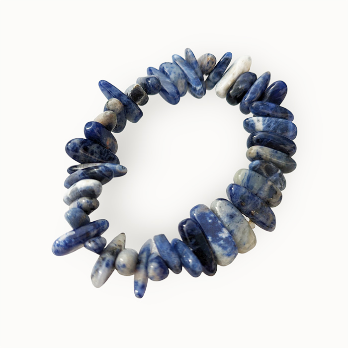 Átlagos méretű rugalmas szálra fűzött szodalit ásvány karkötő.
