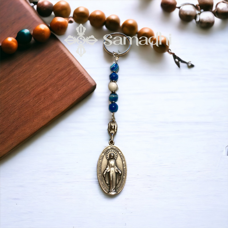 Egyedi spirituális kulcstartó achát és howlit ásványokból, Szűz Mária függővel.