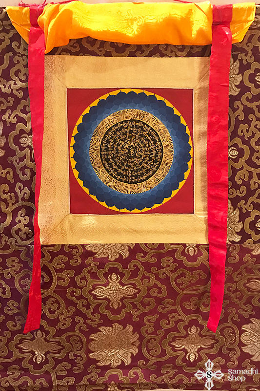 Kézzel festett eredeti buddhista mandala thangka kiváló minőségű brokáttal.