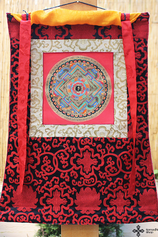 Eredeti nepáli kézzel festett mandala thangka. Mérete brokáttal együtt: kb. 45 x 60 cm. A thangka áldott.