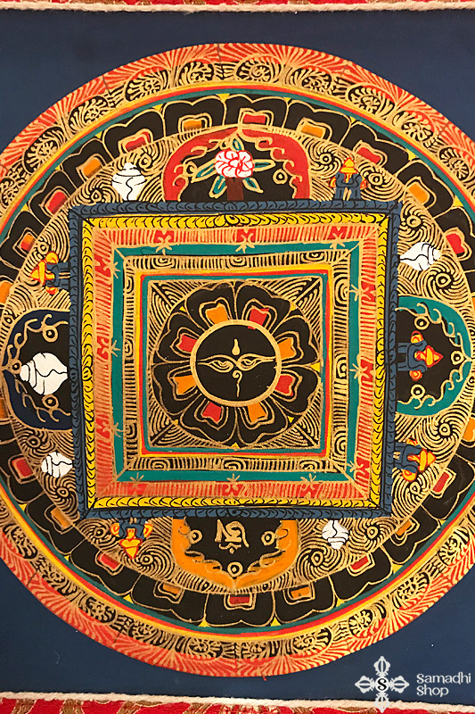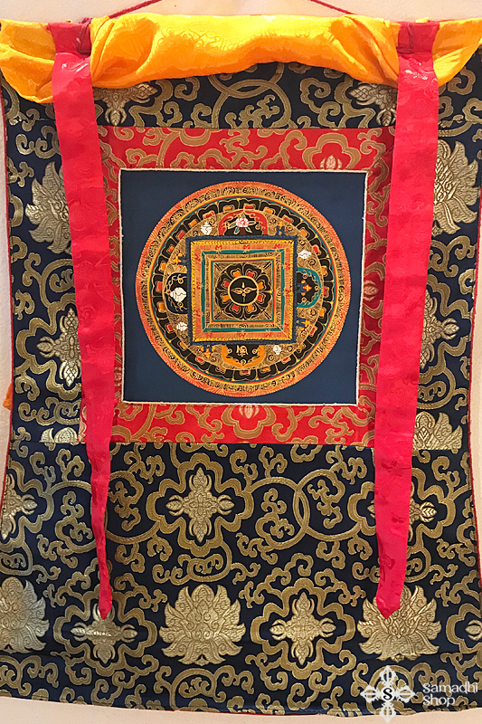 Kézzel festett eredeti buddhista mandala thangka kiváló minőségű brokáttal.