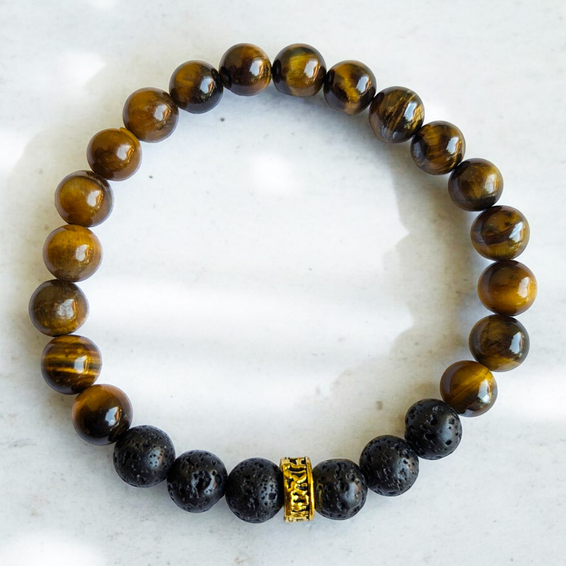 Ez az egyedülálló karkötő a tigrisszem és lávakő ásványok erejét egyesíti az „Om Mani Padme Hum” mantrával díszített osztóval, hogy egy elegáns és spirituális ékszert hozzon létre.